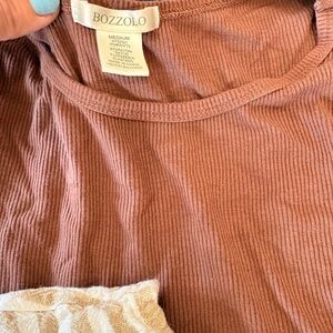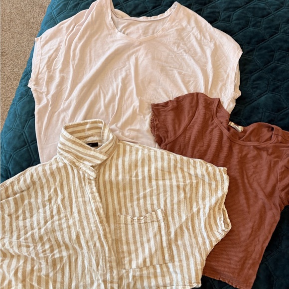 Set of three stylish tops. Includes a soft pink tee with an open back from Beyond Yoga, a ribbed brown tee , and a striped cream cropped button-up. Perfect for casual wear.