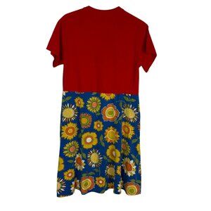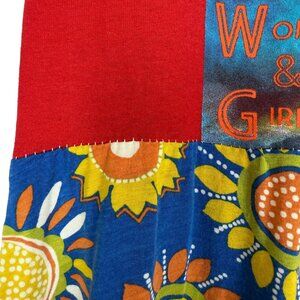 Bold upcycled tee shirt dress handmade from a Montana Powwow MMIWG graphic tee and a colorful sunflower Gudrun Sjödén skirt. A one-of-a-kind statement piece in Size Small—unique, artistic, and meaningful.