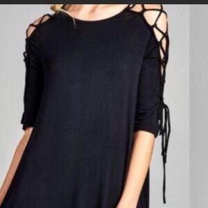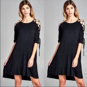 NWT This Dress 👗 is a hot new arrival. This super soft as a tee shirt dress is both comfortable yet hot, hot, hot 🔥. Inspired by the cold shoulder the cut outs on the sleeves are laces giving a new twist to the cold shoulder.