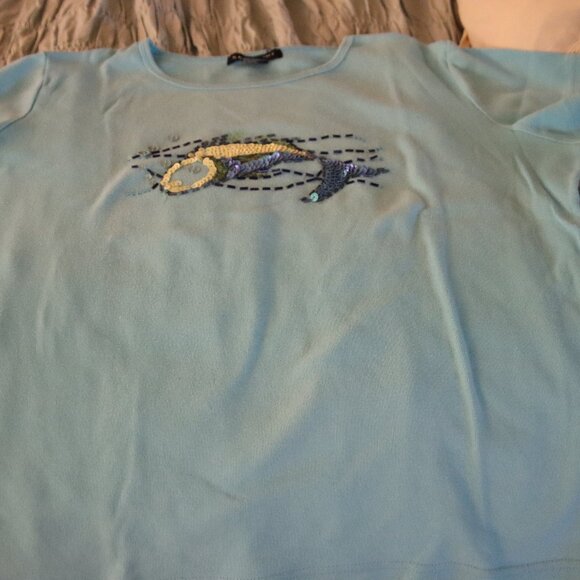 Ladies size L Tee Shirt with a Sequin Fish. Light Aqua