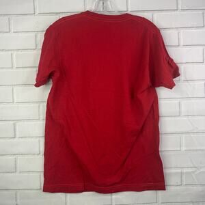 Shirt color: red with metallic silver lettering