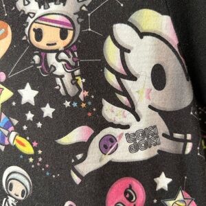Dive into a cosmic journey with this tokidoki tee. Features astronauts, planets, and playful characters. Black base enhances the vibrant design.