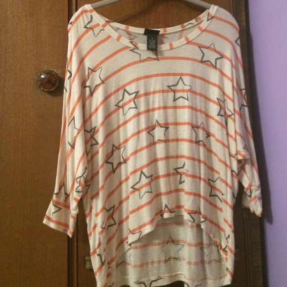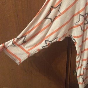 3/4 sleeves, wide rounded neck so lays on top of shoulders, and has longer back then front.
