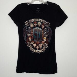 TeeFury 50th Anniversary Doctor Who Graphic Tee. Preshrunk cotton fitted tee with graphic screen print of Doctor Who characters. Perfect for any Whovian! I'm so sad this doesn't fit me. Please see measurements below, very fitted for a size medium. Excellent condition, washed and unworn.