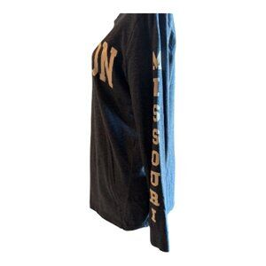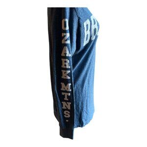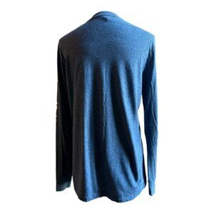 Blue, long sleeve tee with writing in white, crew neckline and cuffed sleeves.