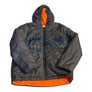 This teen boys coat is great for school or outdoor activites, walking, playing, skiing, climbing, raveling and also suit for taking it as daily wear. In good condition. The coat is a charcoal/ dark gray color with a middle camouflage design. Ships fast!