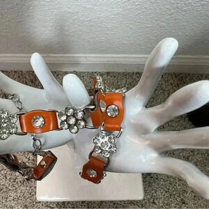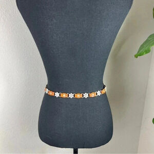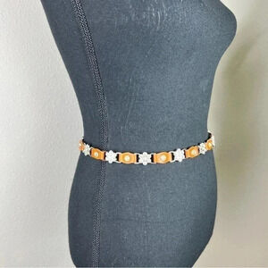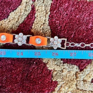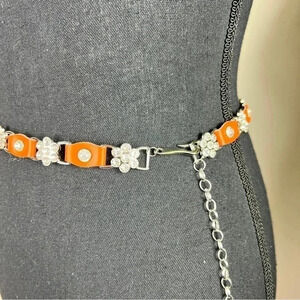 Teenage Girl’s sparkly rhinestone flower design with bright orange leather tabs in between make up this silver tone chainlink belt with extender. ***Styled on a size 4 mannequin*** Size: Small In EXCELLENT condition! No missing stones. {identical turquoise belt also available in my closet.} •Bundle and SAVE!!!•