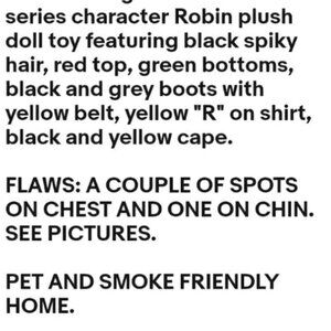 Teen titans go animated TV series character Robin plush doll toy featuring black spiky hair, red top, green bottoms, black and grey boots with yellow belt, yellow "R" on shirt, black and yellow cape.