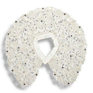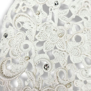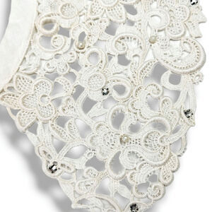 ● Mid-Century Modern intricately detailed needlelace with pearl bead and clear rhinestone accents.