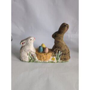 Teena Flanner EASTER BUNNIES WITH BASKET Figurine Rabbit Spring. Measures about: 5 3/4 inches tall x 7 1/2 inches wide x 1 3/4 inches deep.Nonsmoking home.