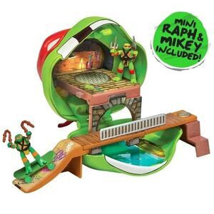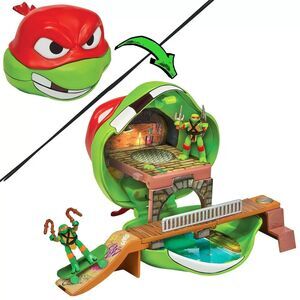 Skate into ninja action with Raphael and Mikey as they transform their underground lair into a high-energy sewer skatepark! The Big Mouth Playset Raphael flips open from a turtle head into a complete skate scene with a grind rail ramp and skateboard for next-level tricks. Exclusive mini figures of Raphael and Michelangelo are included, making it perfect for fast-paced battles or freestyle skating fun. When the action is over, fold it back into Raphaels head for easy storage.
