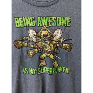 T-Shirt has graphic of all 4 turtles Donatello, Leonardo, Raphael, and Michelangelo all in fighting stance with their weapons at hand. This graphic also says "Being Awesome Is My Superpower."