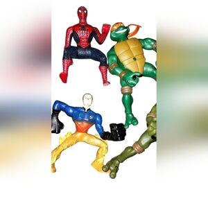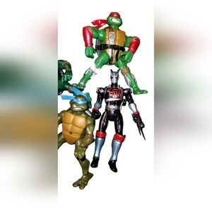 Set of Teenage Mutant Ninja Turtles and action figures. Includes vibrant green, red, blue, and orange colors.