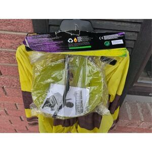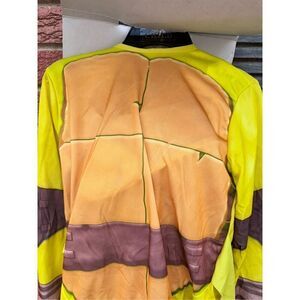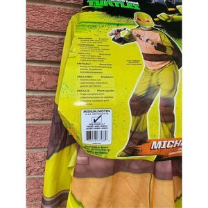 Nickelodeon teenage mutant ninja Turtles Halloween costume. Sizes medium. USA size 8 to 10. This is Michelangelo child costume. It includes jumpsuit with shoe covers mask and stuff shell. The cardboard. Front cover is kind of in bad shape. The rest of the costume is sealed the helmet is sealed in plastic and there is directions inside. No rips, tears stains. Green and brown colors.