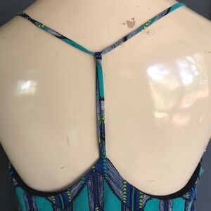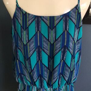 Teenplo teal/blue/black/yellow geometric print tank. Elasticized waist to create slight blouson top. Bodice lined in solid black. Narrow straps threaded through center vertical loop in back. No fabric content or size tags but fits like small.