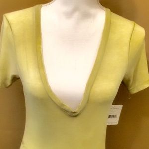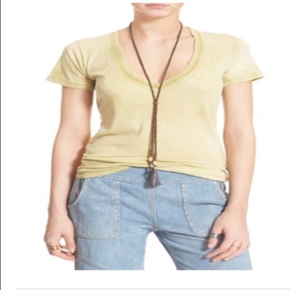 Easy, effortless tee featuring V-neckline with raw edged detailing and subtly exposed seaming.