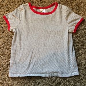 Right: Black and white striped baby tee with red trims on the sleeves and neckline. No stains or rips. It is made with 60% cotton and 40% polyester. Nice,cool material