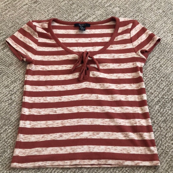 This is a cute orange and white striped shirt! It has a tie in the front, and is very stretchy so fits well! It’s in great condition because it’s barely ever been worn before!