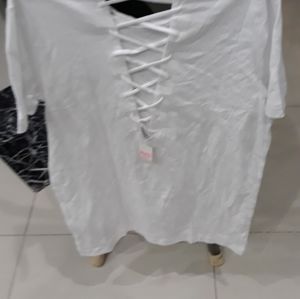 White teeshirt with pink printed in left hand corner and design on back.