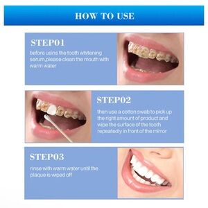 Usage for Teeth Whitening Essence: Before use, please clean the mouth with warm water, then use a cotton swab to dip proper amount of the product, wipe the teeth surface evenly and rinse it with clean water after 15-20 minutes, we recomend to use 2-3 times per week.