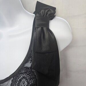Spaghetti strap right shoulder, Satin bow strap left shoulder