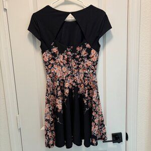 Teeze Me fit & flare dress. Fitted at waist. Dark navy (appears black in certain light) and floral print. Line with 100% polyester. Dress is 96% polyester, 4% spandex. Keyhole with one button on back, 12" zipper on back. Approx. measurements: fitted waist 13", pit to pit 16", should to fitted waist 15", shoulder to bottom 32". Excellent preowned condition. No flaws.