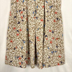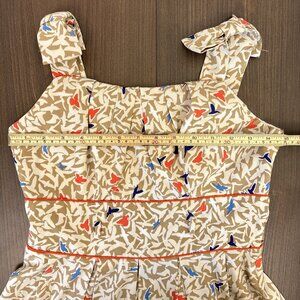 Charming and playful, this Teeze Me fit and flare dress features a whimsical allover bird print in red, blue, and navy on a beige background. Designed with feminine details like bow tie on straps, pleated skirt, and contrast piping at the waist, it's perfect for spring and summer outings. Please note: original belt is missing.
