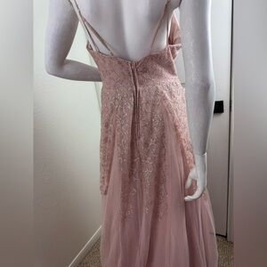 Stunning pink lace gown with intricate detailing. Perfect for formal occasions.