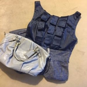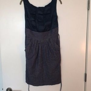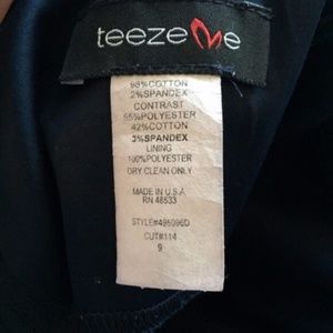 Teeze Me sleeveless dress with a blue ruffled front. Bottoms is a tweed print it. Pockets and it ties in the back. Macy's brand. Junior’s size 9. Top part: 98% cotton, 2% spandex. Bottom part: 55% polyester, 42% cotton, 3% spandex. Lining 100% polyester. Length from shoulder 32”, waist laying flat 14”, bust laying flat 16.5”.