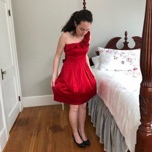 This dress is gorgeous and makes you feel like a princess wearing it. It features rosettes climbing the left shoulder along with a ruffle, a back sash, and a pleated full skirt with sewn in crinoline for volume. For reference, the model's measurements are 32/26/39