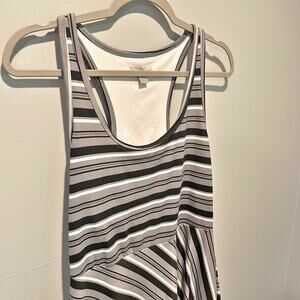 Black, white and gray stripe pattern. Fit and flare style. Built in bra.