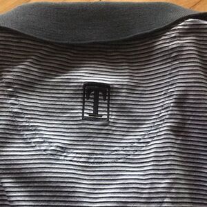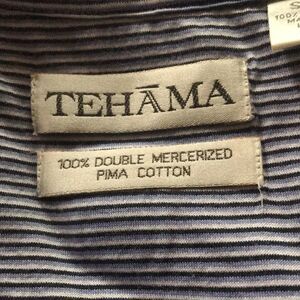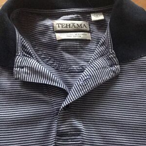 Tehama light blue/navy/white finely striped polo. 3 button placket. Solid ribbed navy collar. Shirt sleeves. 100% pima cotton. Size small. Excellent condition. Nonsmoking home.