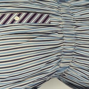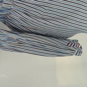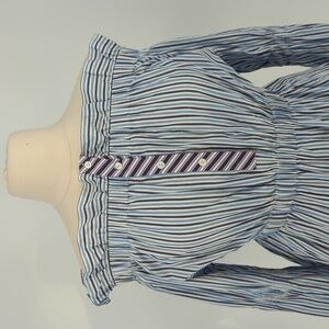 Description: Blue and white stripes, off shoulder ruffle detail, button front, elastic waist, side slit at hem, balloon sleeves with buttons, elastic neckline. 100% Cotton. Dry clean.