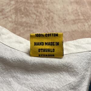 Lightweight long sleeve white shirt with center vertical and horizontal tapestry patch work stripes. Mirrored stripe on the back that can be cinched. V neckline, button closure. Vintage 1990s.