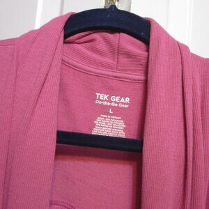 From Tek Gear: Poly/rayon/spandex knit cardigan in size large. Pretty berry pink color. Soft, light-weight jersey knit with slight ribbing on shawl collar, hem banding and extended cuffs with thumb hole. Decorative seaming on sleeves and front pockets. Back yoke with box pleat. Generous sizing. Open front styling, but back measurement is 44" and length is 32".