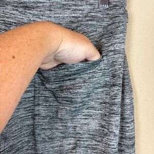 Tek Gear Black/Gray Heathered Stretch Relaxed Athletic Workout Pants with String Tie Waist, Zippered Side Pockets, 2 Back Slide Pockets, and Ankle Pull Cord Adjustment; Women's Size Medium; When lying flat, measures 14.74" waist, 30.5" in-seam, 11" rise, and 8" bottom pant leg width (relaxed); Polyester/Spandex; Machine wash cold with like colors, only non-chlorine bleach when needed, tumble dry low, remove promptly, cool iron if needed