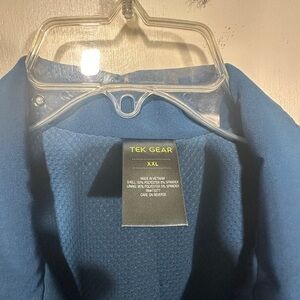 This Tek Gear utility jacket in a striking blue hue offers a relaxed fit with a full-length zipper and a cinched waist for a customizable silhouette. Ideal for casual outings, its lightweight fabric ensures comfort and versatility.