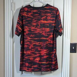 This sweat-wicking t-shirt features an abstract red and black print, 100% polyester construction (33% of which is recycled) and UV protection up to UPF 40+. Item is new with tags and shows no damage or wear.
