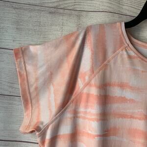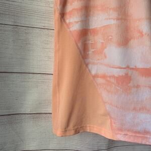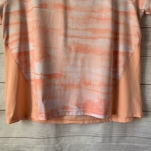 Peach and white short-sleeved active shirt by Tek Gear Dry Tek. This pullover shirt has a marbled tie-dye pattern on the front and upper back. The sides and lower back are a solid peach color with thin horizontal lines. It is pre-owned with a very small spot on the front but is otherwise in great condition.