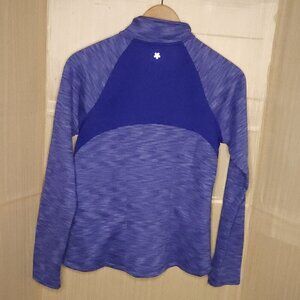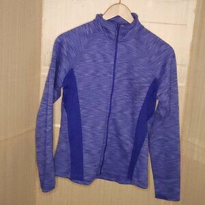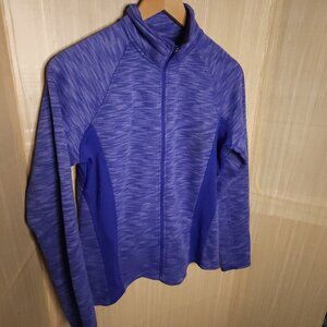 Tek Gear purple zip up jacket. Only worn a few times. Has thumb holes. Measurements are 21" from armpit to armpit, 32" from under collar to the end of the cuff, and 26" from shoulder to hem.