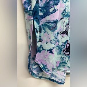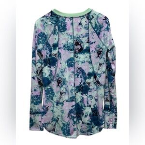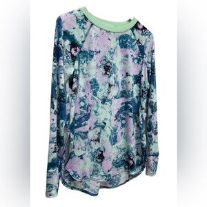 Colorful long sleeve shirt with a dynamic swirl pattern. Ideal for playful days. Super soft and comfortable. Pretty colors. Sz M Tek Gear On-the-Go-Gear. Thumb hole. High low top