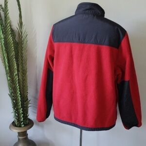 Red and black fleece jacket with 4 zippered pockets and nylon accents. It does have some pilling typical with fleece.