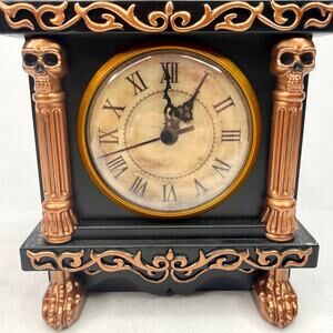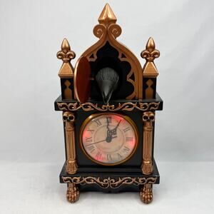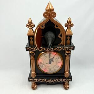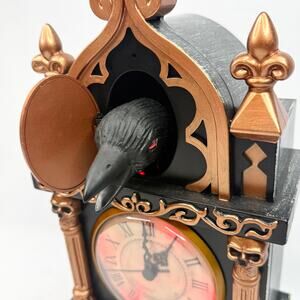 Tekky copper and black plastic animated spooky clock Halloween decor. Lights up with sound and has a crow that pops out. Batteries not included.
