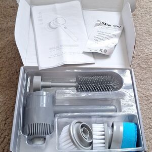 Includes cordless Palm Scrubber, sponge brush, bristle brush, tapered brush, long silicone brush, and USB cable