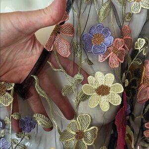 Chic mini dress with colorful floral design. Sheer fabric adds elegance. See pictures for approximate measurements laying flat
