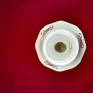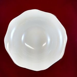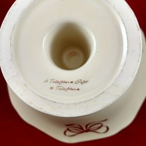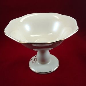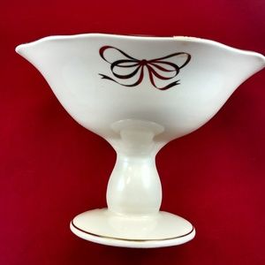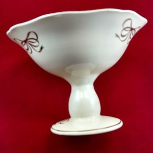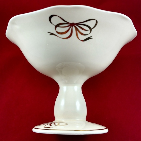 Teleflora pedestal cream-color bowl has golden trim around the scalloped edge at the top and at the base, as well as golden bows decorating the outside in an exquisite manner. There are three stylish golden ribbons around the upper exterior of the bowl. The pedestal of the bowl also has a golden trim around the base.