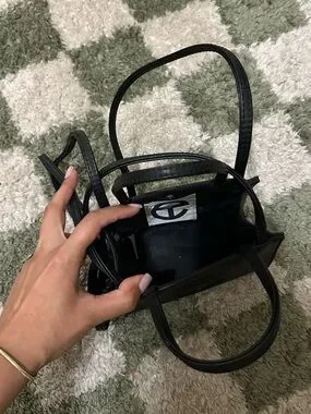 Sleek Telfar mini bag in smooth black leather. Raised embossed circular logo on front. Dual top handles for hand carry. Structured silhouette for a modern look. Perfect for essentials and everyday style.