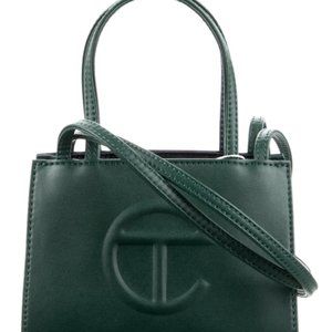 The dark olive green Telfar Bag is a fashion-forward yet subtle everyday bag for everyone. Featuring a double strap (handles and cross-body straps), embossed logo, and magnetic snap closure. Made from faux leather and twill lining. The bag is packaged in a 100% cotton drawstring bag with screen-printed logo. Small is the party bag + the afterparty too.