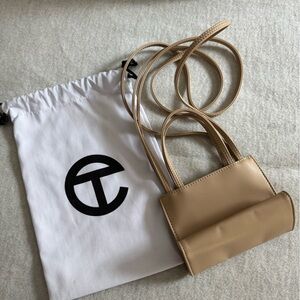 Stylish Telfar mini bag in beige. Features iconic logo. Perfect for any outfit.
