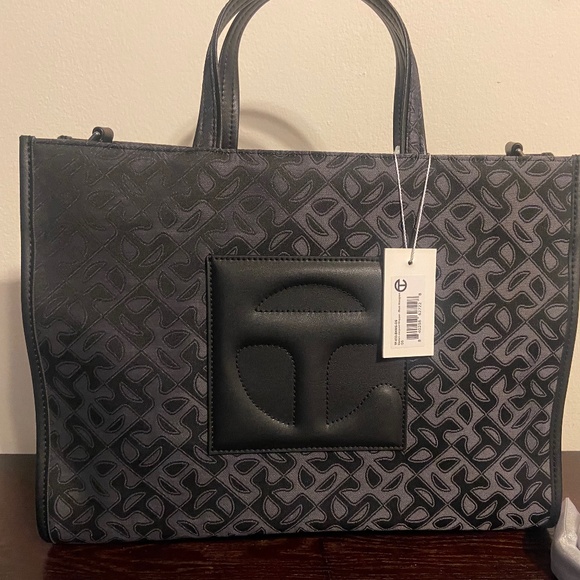 Brand new, with signature drawstring dust bag with Telfar logo! The iconic Telfar shaped shopping bag has the signature woven monogram jacquard with embossed logo compartment. Features removable and adjustable strap to wear over the shoulder or as a crossbody. Functional logo pocket in the front, logo zipper closure for the main compartment and internal zipper pocket.